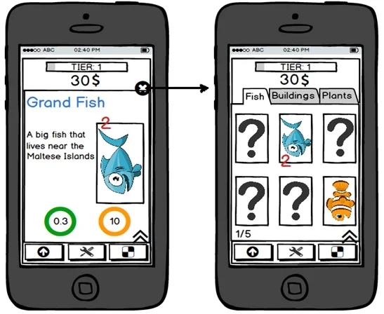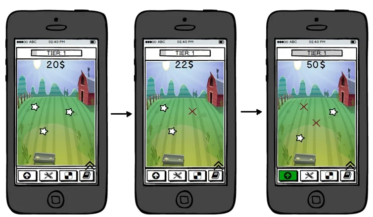 Taping (optional player interaction) - Tapping is the other way for players to gather resources; the player needs to tap on spawning stars (red x is a tap) to collect gold and increase the tier bar. The tier bar is the levelling system, the higher the tier number the more researching and upgrading can be done to your farm!
