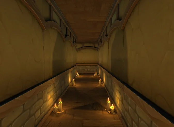 The kitchen area is a standard room; the switch is located at the back end, unlike most of the previous rooms I wanted the player to explore a little instead of finding all the switches close to the entrances. The switch will reveal a hidden door that leads to an underground path. The path is narrow and filled with candle sticks glowing to aid them a little in walking in the right direction; I wanted to instill a spooky and dangerous mood here, something that added a little more contrast to the flamboyant orange and yellow lighting in the previous rooms. The candle trail will end near the foot of a table which contains a codex on top, by interacting with it; the table will rise and stop in the final room of the level: The tower!