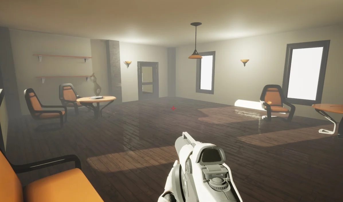 The first room that you will enter is the living room; a main room that contains some primitive furniture and some light shafts from the windows. The furniture was constructed using standard assets; including the light holders which contain stationary light sources that were baked onto the meshes.