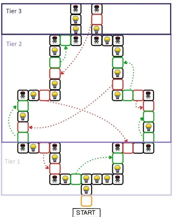 I thought it would be ideal for players (especially new comers) to have a slower start at the beginning which will then translate to more complex situations as they progress and get closer to the stage (end point). I tackled this be introducing tiers; the game board is split into 3 (tiers/areas) At the beginning (tier 1) bouncers apply the normal rules. As the player progresses and enters new areas bouncers will receive global perks in that region such as: +1 to each roll they get on the die (if its a 6, then it will remain a 6). This made the game more challenging and rewarding when players manage to get a string of good rolls in succession!